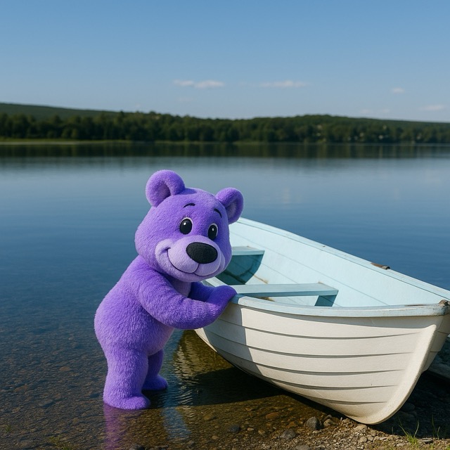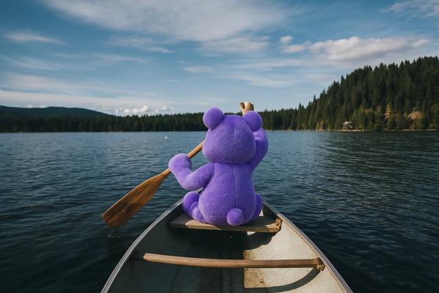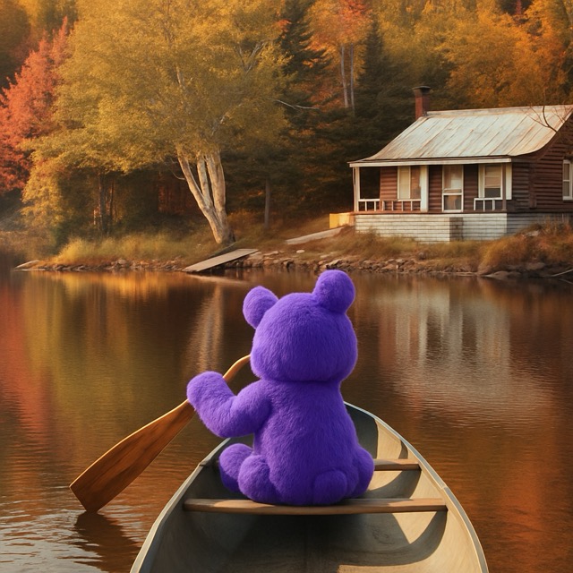 Doudours est parti ce matin. Il fait un dernier câlin à ses cousins les ours du Canada puis il a rejoint le bord du lac. Une belle barque l’attendait.