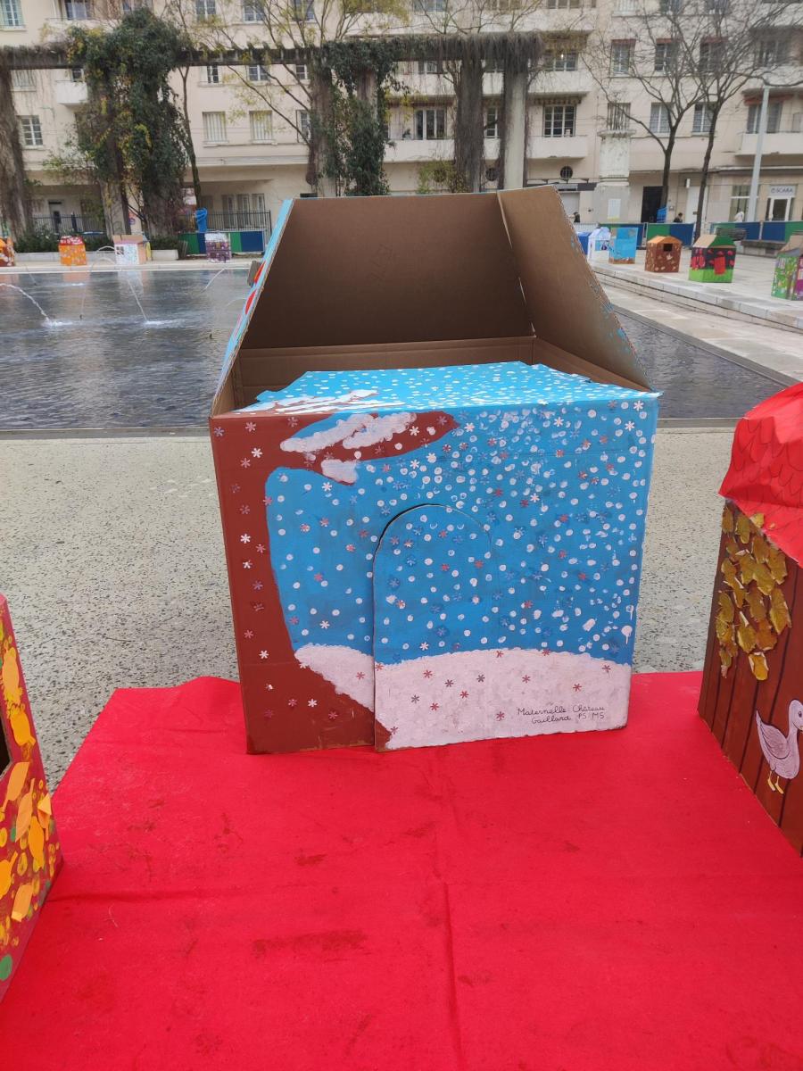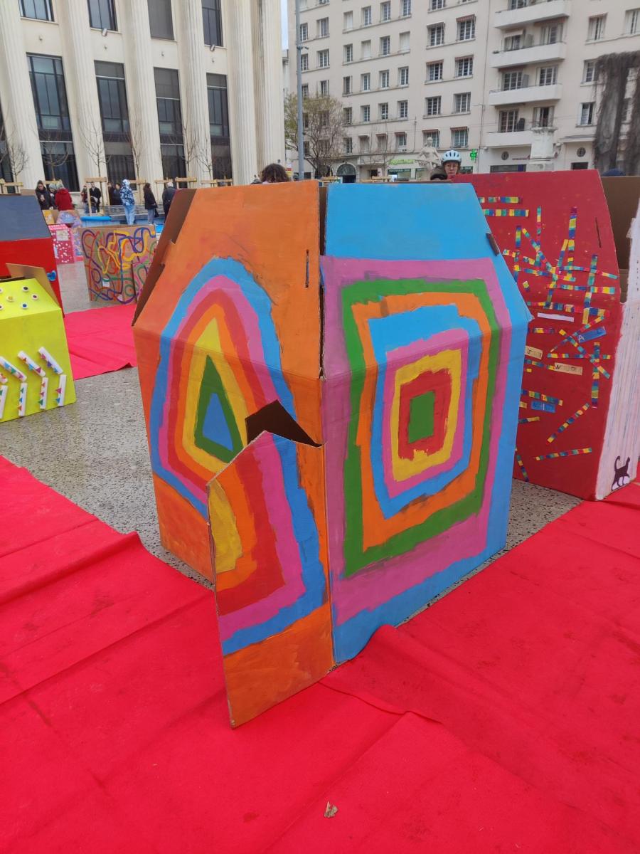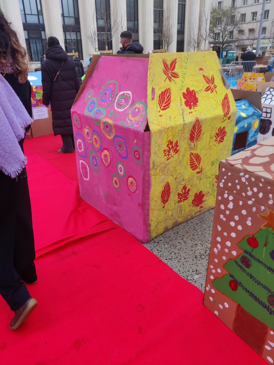 Il y avait un Village avec des Cabanes peintes par les enfants de plusieurs écoles de Villeurbanne. Chaque classe de notre école maternelle y a participé.